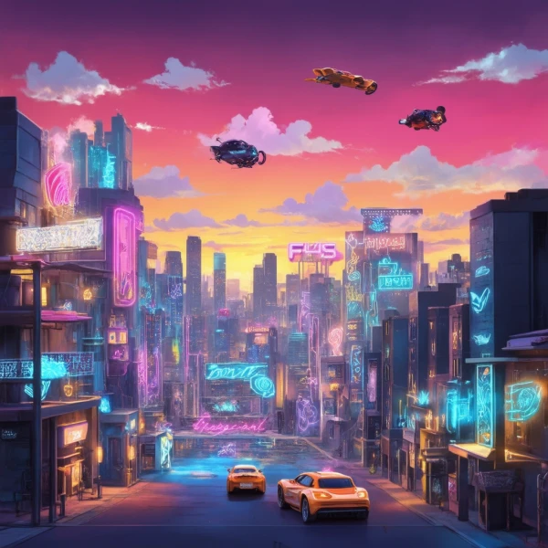 A whimsical, colorful cityscape at dusk, with glowing neon signs and flying cars. The sky is a vibrant gradient of pink, orange, and purple, with fluffy clouds. The buildings are a mix of futuristic and retro styles, with intricate details and holographic projections.