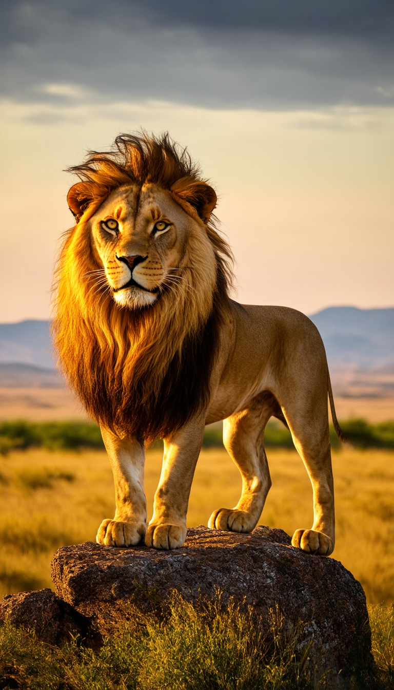 A majestic lion with a flowing mane, standing proudly on a rock overlooking a vast savanna, bathed in the warm glow of the setting sun. The lion's eyes are piercing, reflecting the golden light, and its muscles are rippling with power. The savanna is a vibrant tapestry of green grass, acacia trees, and distant mountains.