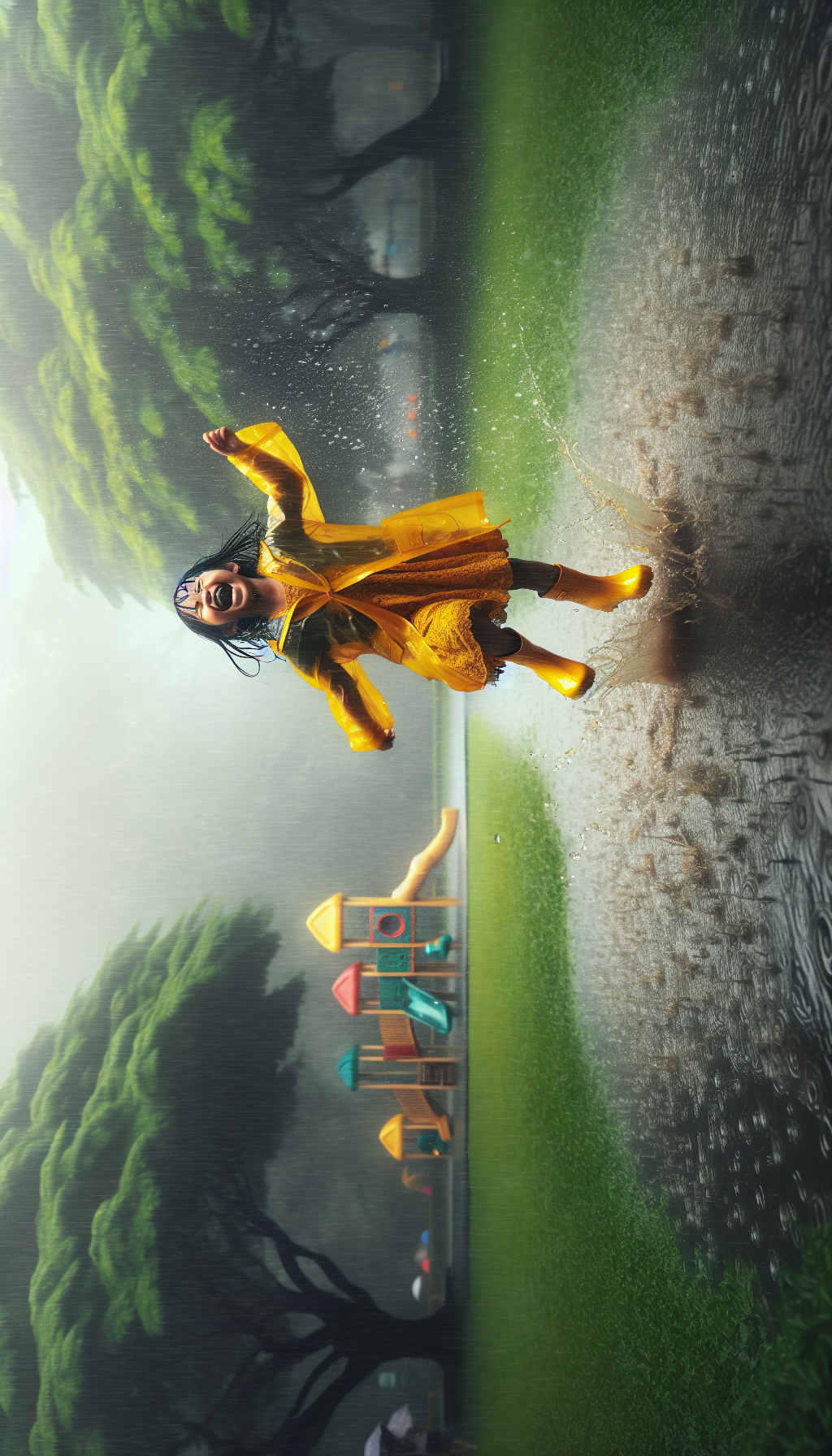 A young girl, wearing a bright yellow raincoat and boots, jumps in a giant puddle, splashing water high in the air. Rain is falling softly, creating a misty atmosphere. The background is a lush green park with trees and a colorful playground in the distance. The scene is filled with joy and a sense of childhood wonder.