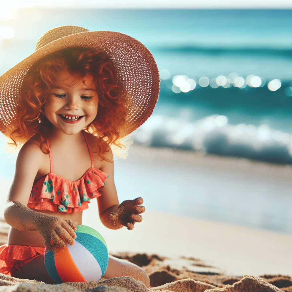Beach Day: Depict a cheerful girl with curly red hair, wearing a bright bikini and a wide-brimmed hat, enjoying a sunny day at the beach. She is playing in the sand with a beach ball, with the ocean waves gently crashing in the background.