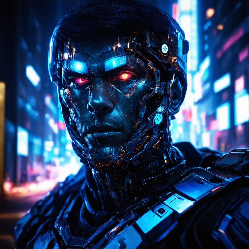 A hyperrealistic portrait of a futuristic cyborg warrior, illuminated by a holographic display showcasing the cityscape of a neon-lit metropolis. The cyborg's face shows both human and mechanical features, with intricate circuitry and glowing LEDs. The background is blurred, highlighting the cyborg's sharp focus.