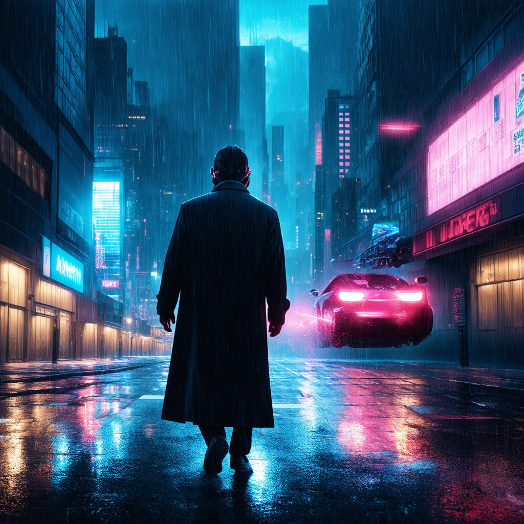 A cyberpunk cityscape at night, neon lights reflecting off rain-slicked streets. A lone figure in a trench coat walks past towering skyscrapers, their face obscured by a holographic mask. In the distance, a flying car zooms through the air, leaving a glowing trail.