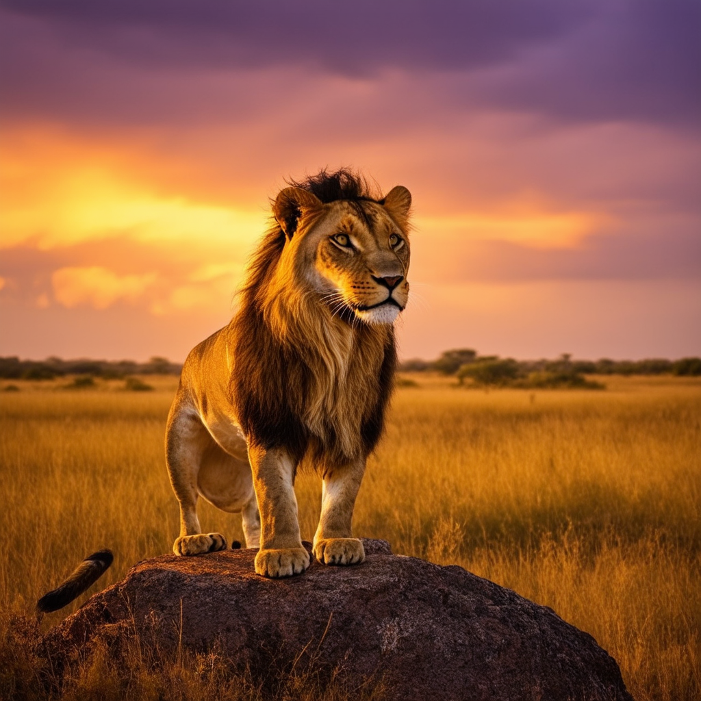 A majestic lioness with a flowing mane, perched on a rock overlooking a vast savanna at sunset. The sky is ablaze with vibrant hues of orange, pink, and purple, casting long shadows across the grasslands. The lioness's eyes gleam with intelligence and power, as she surveys her domain with a sense of regal confidence.