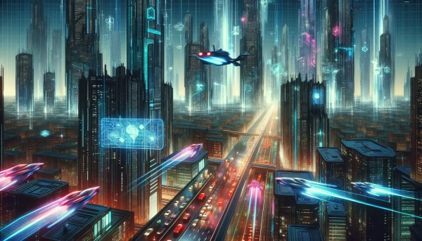 A futuristic cityscape drenched in neon light reflecting in rain puddles, with flying cars weaving through towering skyscrapers. Holographic billboards advertise a virtual reality experience, creating a vibrant, neon-drenched atmosphere. The scene exudes a sense of awe and danger.