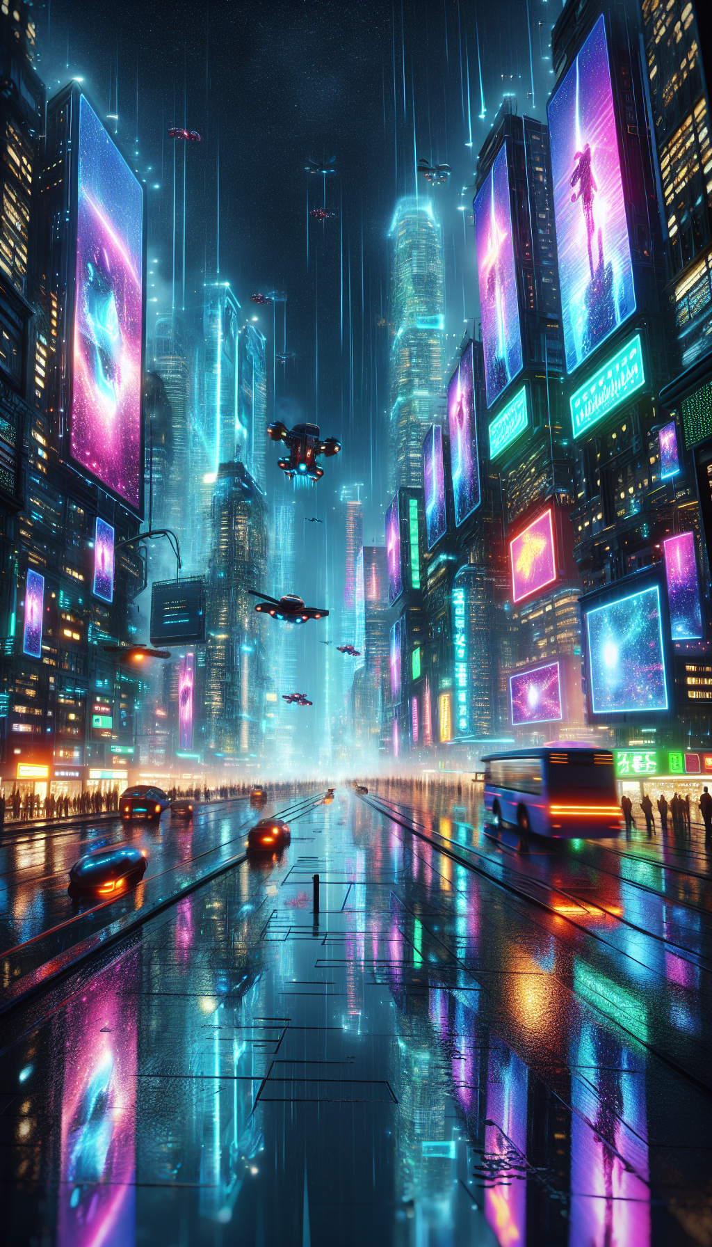A futuristic cityscape, drenched in neon rain, with flying cars navigating between towering skyscrapers. Holographic billboards, advertising a VR experience, cast vibrant neon reflections in rain puddles. The scene is a blend of awe and danger, a futuristic metropolis where technology and nature clash.