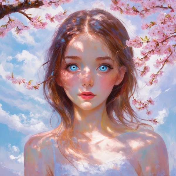 A whimsical, dreamlike portrait of a young woman with glowing blue eyes, surrounded by swirling clouds and a blooming cherry blossom tree, painted in a vibrant, painterly style with soft lighting and a sense of ethereal beauty.